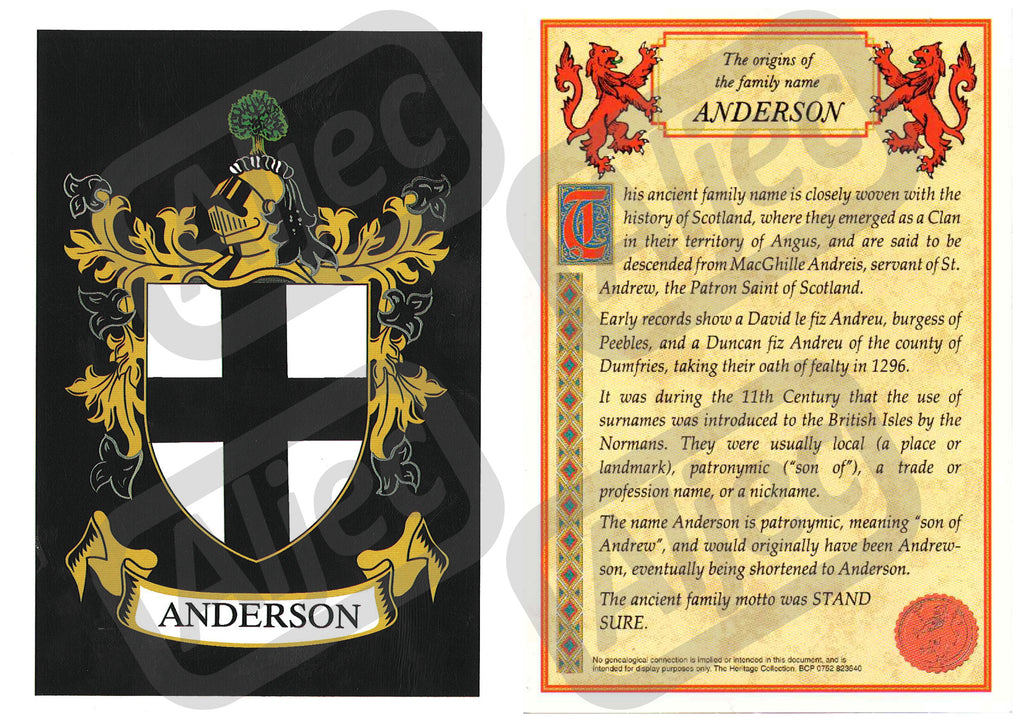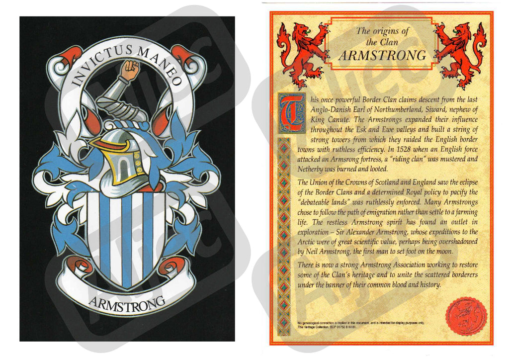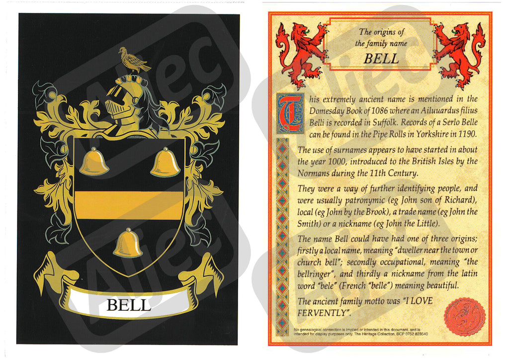 A glossy, high quality postcard showing your family's heraldic coat of arms on the front, with the history of the name on the reverse.
