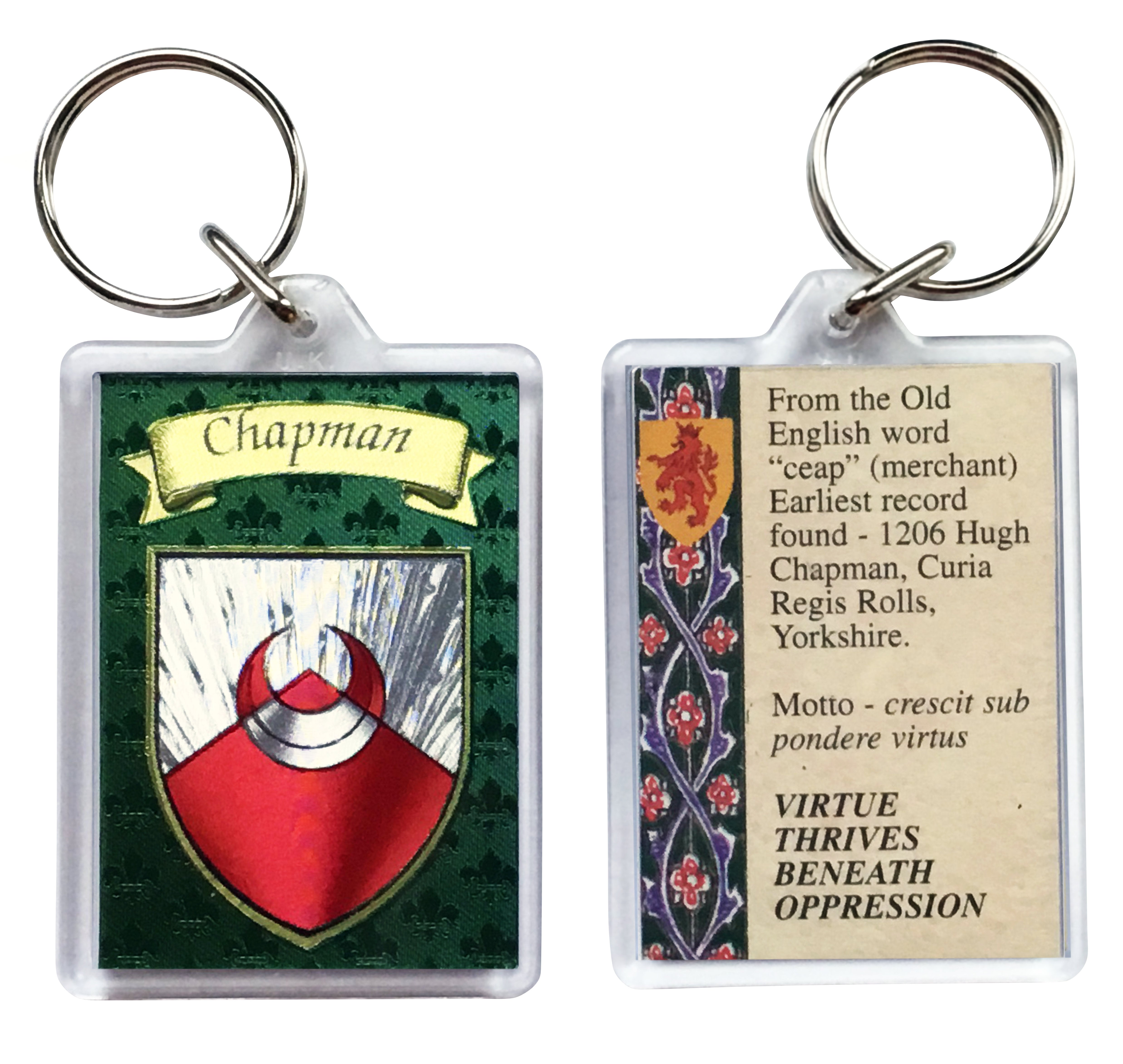 The reverse side shows a beautifully decorated introduction to the history of the surname, including the Chapman family motto - "Crescit sub pondere virtus", meaning "Virtue Thrives Beneath Oppression".